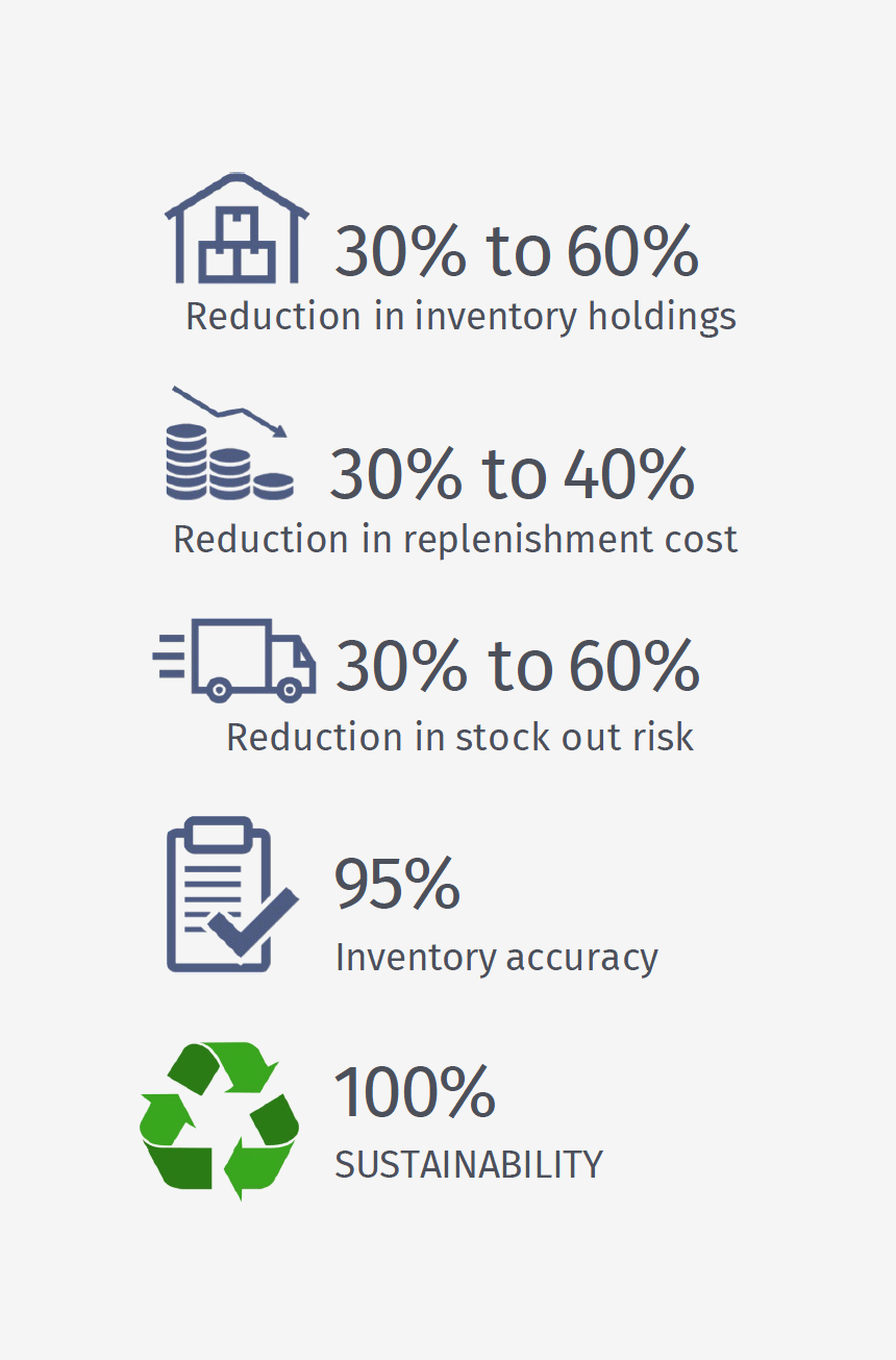 • Optimize your space. A reduced inventory of spare parts can drastically increase available floor or vertical space